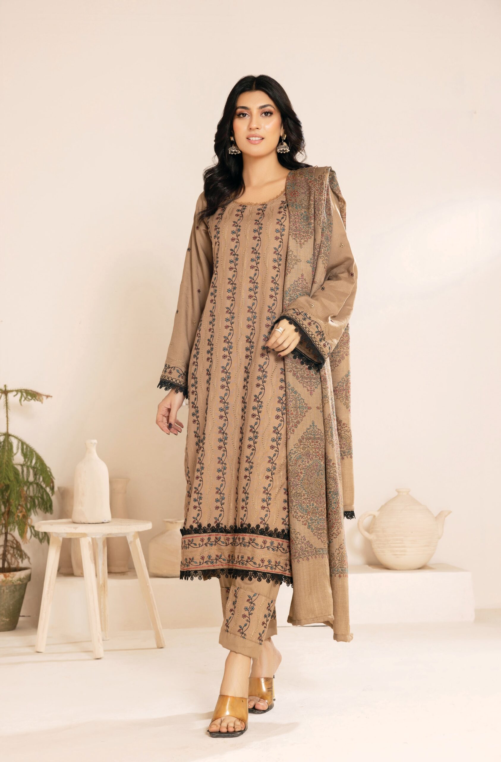 Crafted from premium Dyed Doria Dhanak fabric, this outfit features intricate embroidery and a luxurious Kashmiri touch — perfect for the season.