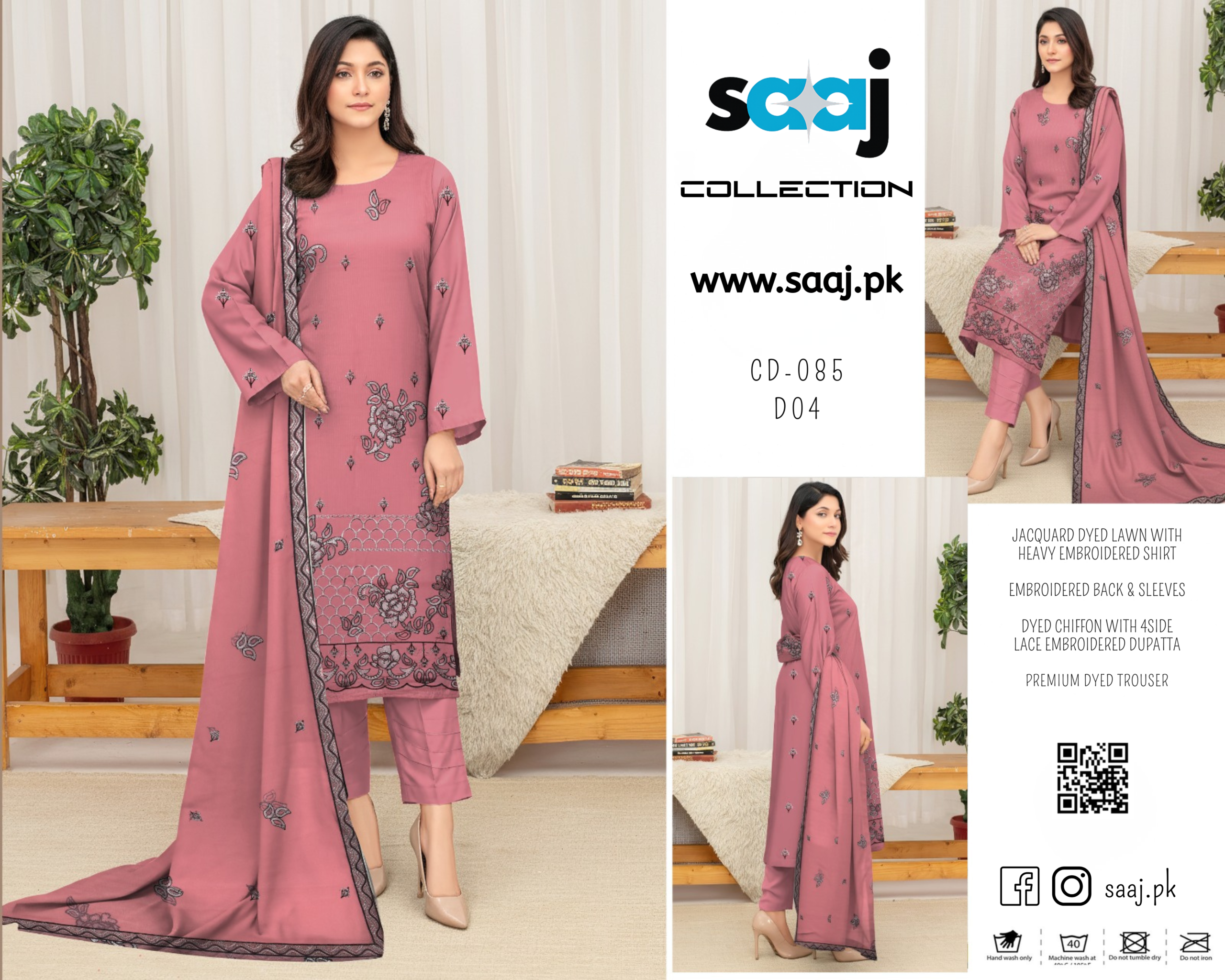 Embroidered Collection, Saaj, WomenJacquard Dyed Lawn Suit with Heavy Embroidered Shirt & 4-Side Lace Chiffon Dupatta – CD-085-D04