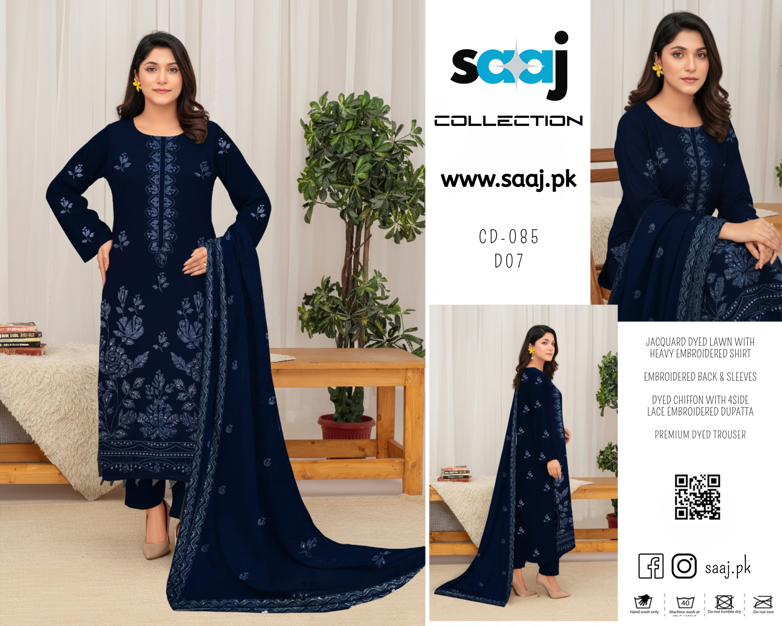 Embroidered Collection, Saaj, WomenJacquard Dyed Lawn Suit with Heavy Embroidered Shirt & 4-Side Lace Chiffon Dupatta – CD-085-D07