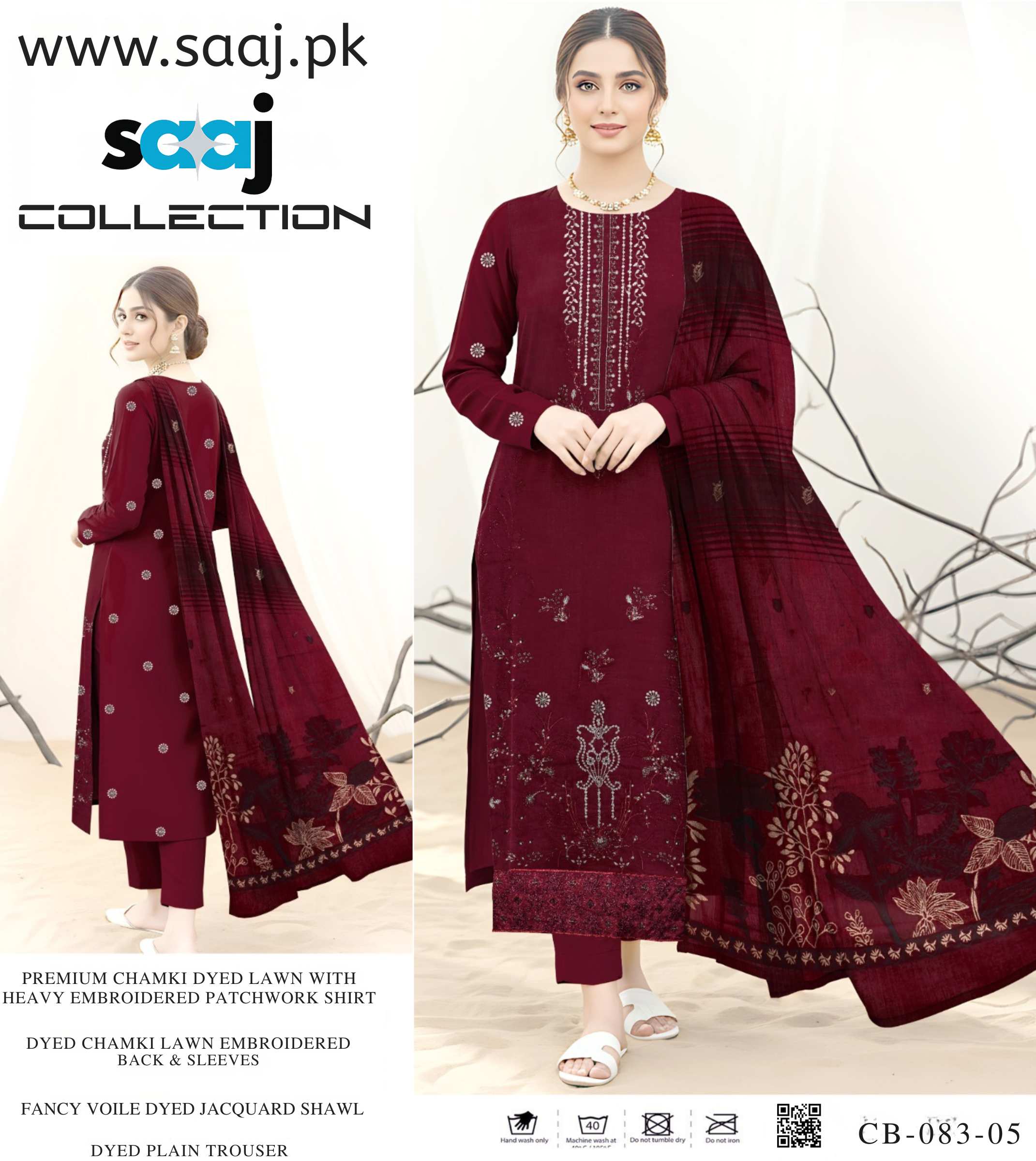 Embroidered Collection, Saaj, WomenPremium Chamki Dyed Lawn Suit with Heavy Embroidered Patchwork Shirt & Jacquard Shawl – CB-083-05
