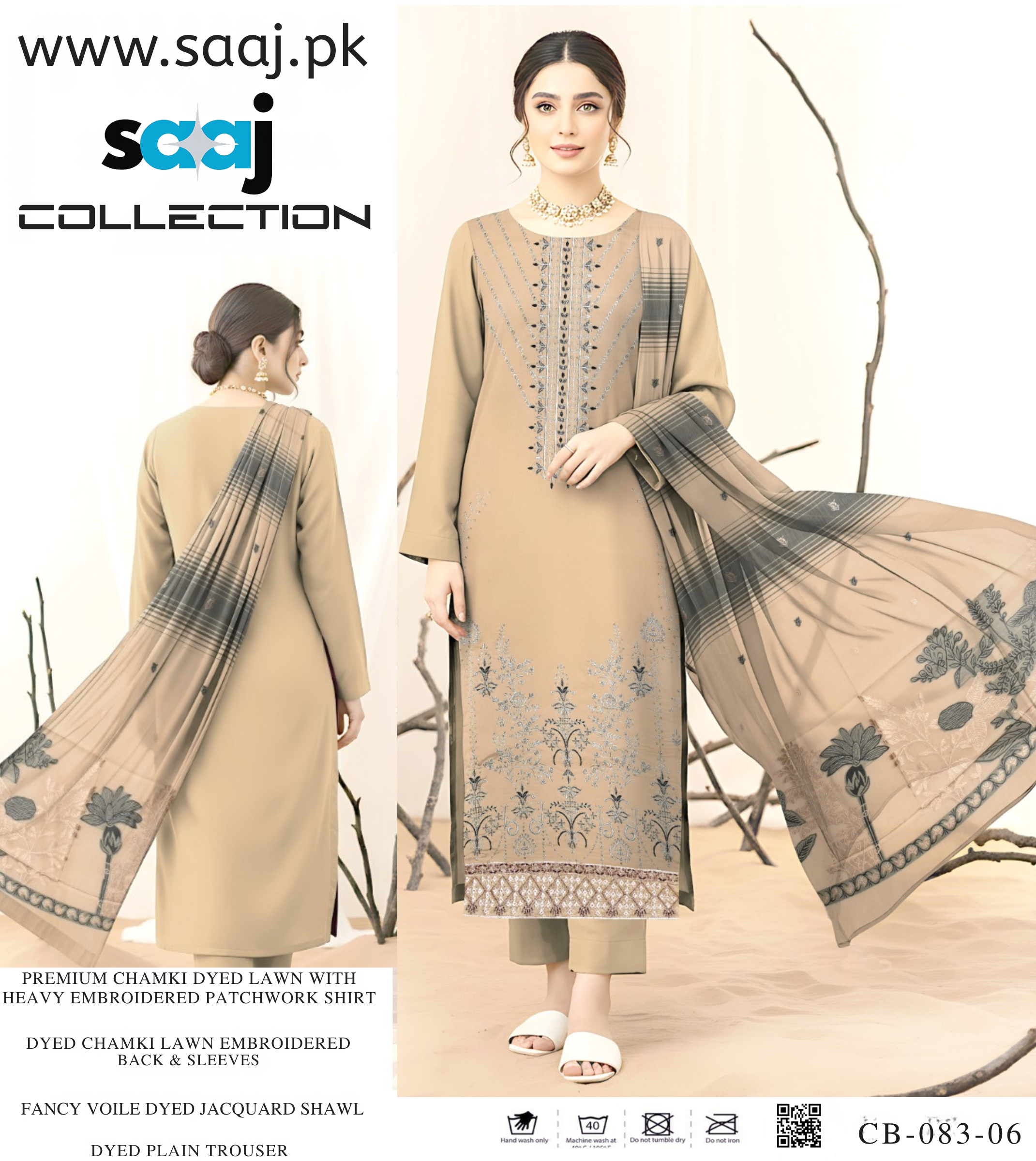 Premium Chamki Dyed Lawn Suit with Heavy Embroidered Patchwork Shirt & Jacquard Shawl – CB-083-06