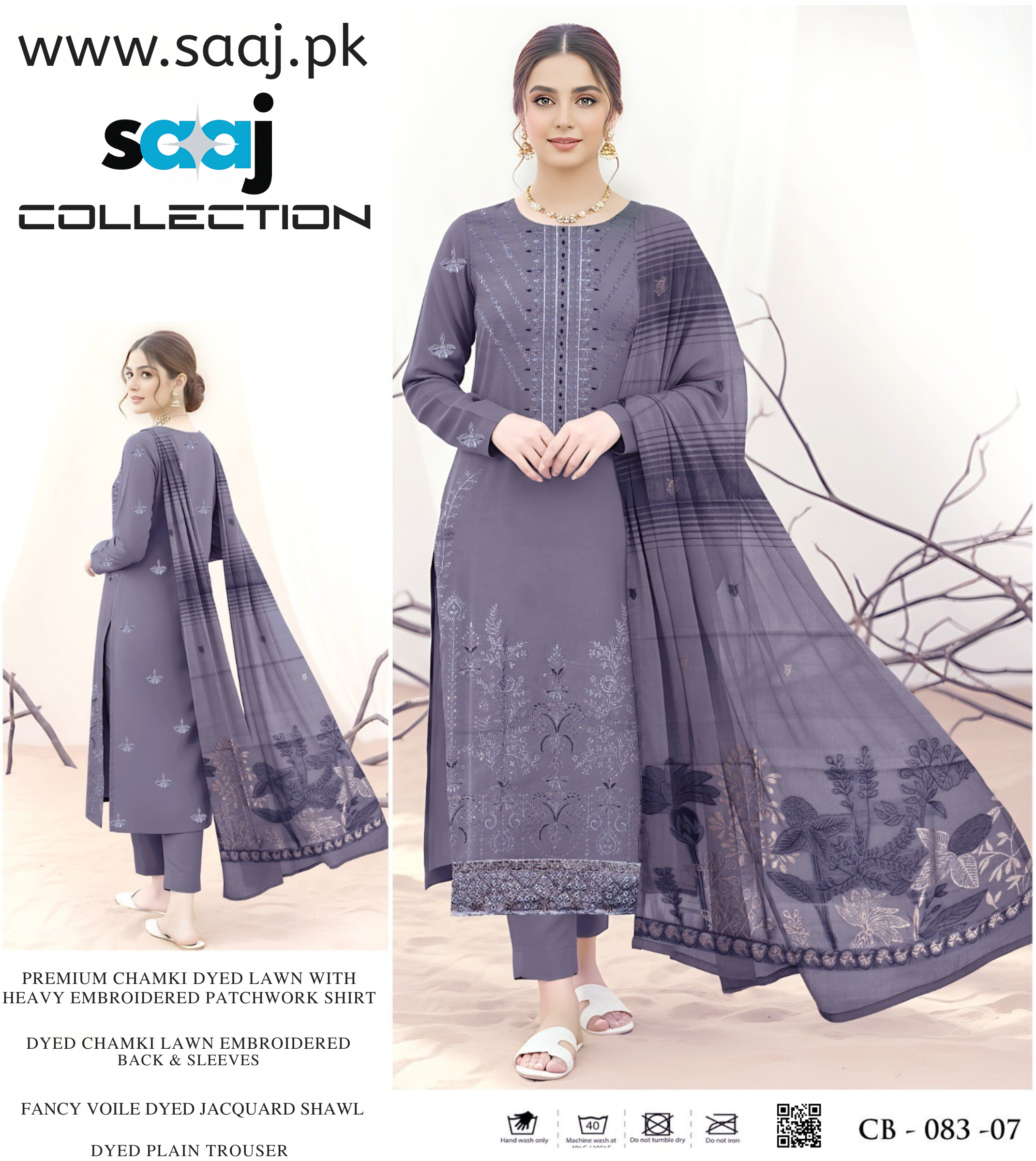 Premium Chamki Dyed Lawn Suit with Heavy Embroidered Patchwork Shirt & Jacquard Shawl – CB-083-07