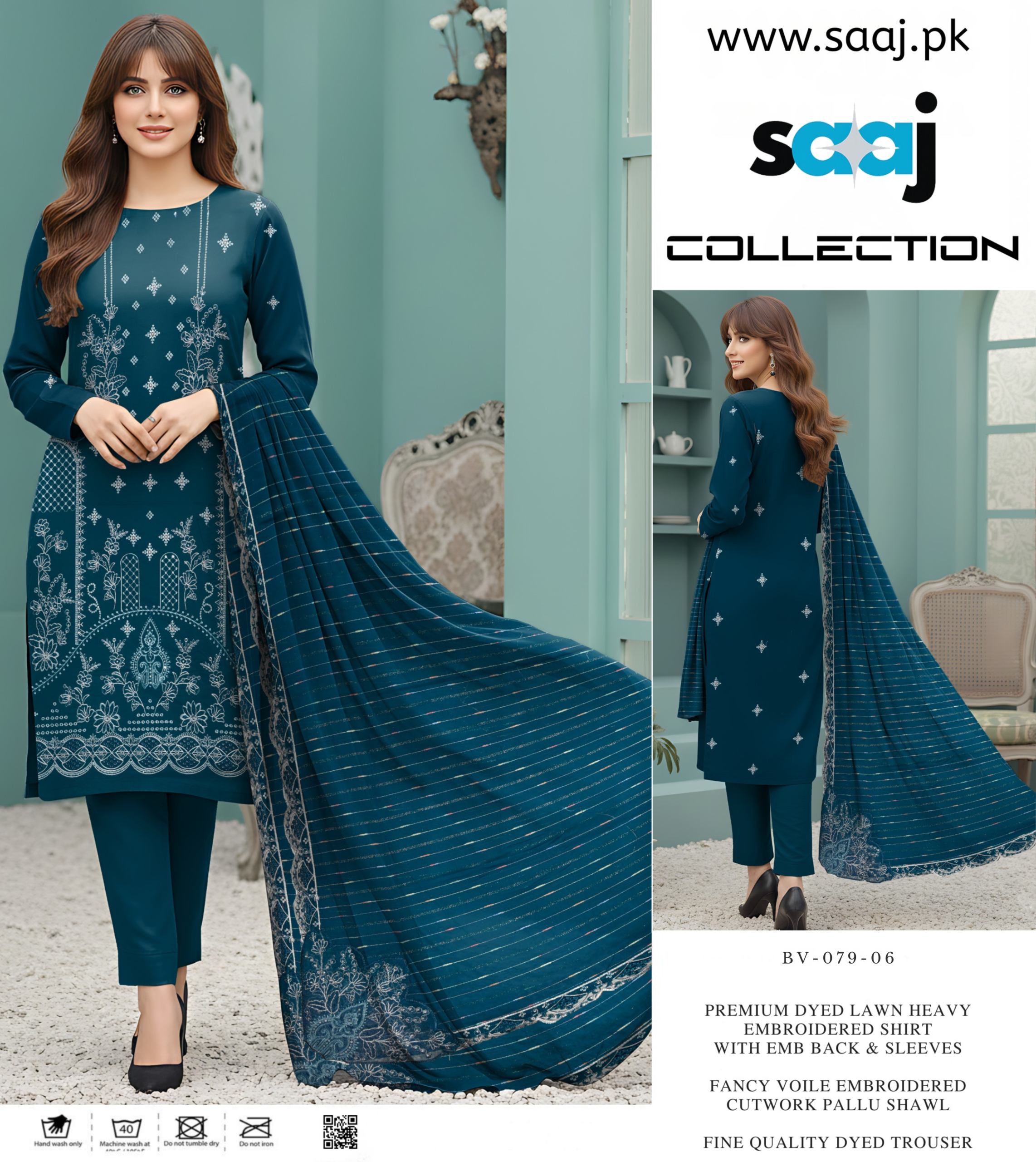 Embroidered Collection, Saaj, WomenPremium Dyed Lawn Heavy Embrodered 3-Piece Suit with Cutwork Voile Shawl – BV-079-06