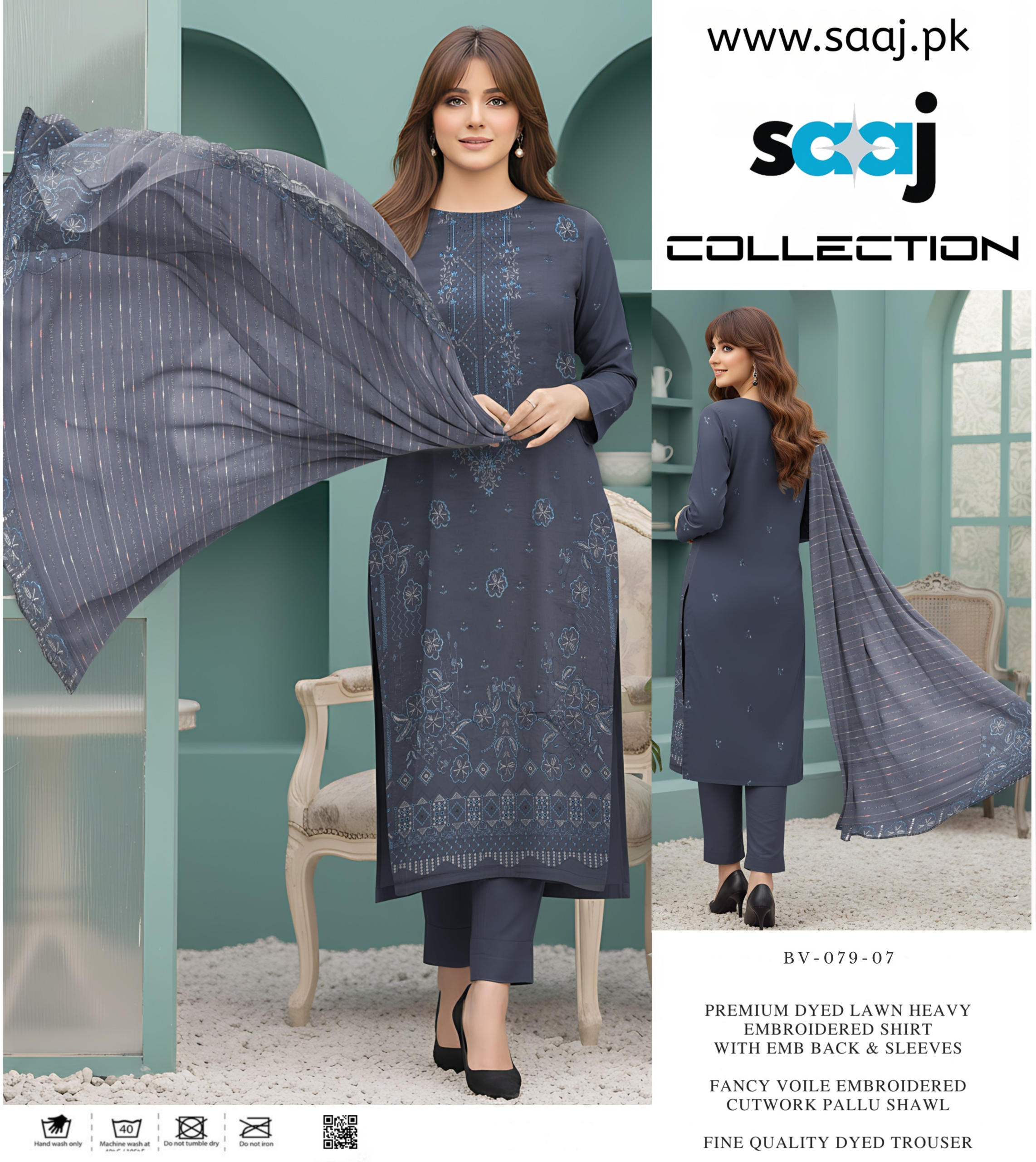 Embroidered Collection, Saaj, WomenPremium Dyed Lawn Heavy Embrodered 3-Piece Suit with Cutwork Voile Shawl – BV-079-07