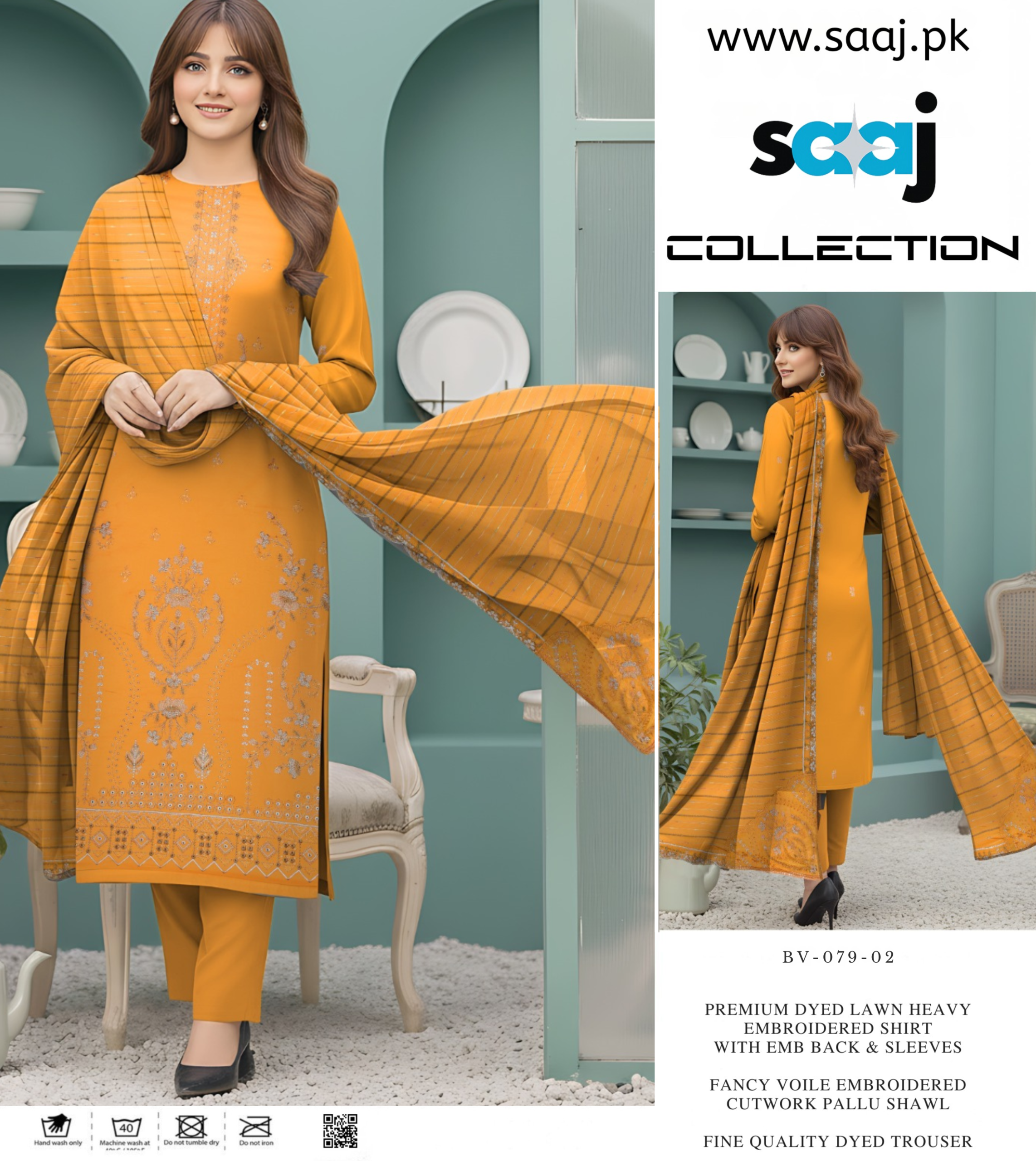Embroidered Collection, Saaj, WomenPremium Dyed Lawn Heavy Embroidered 3-Piece Suit with Cutwork Voile Shawl – BV-079-02