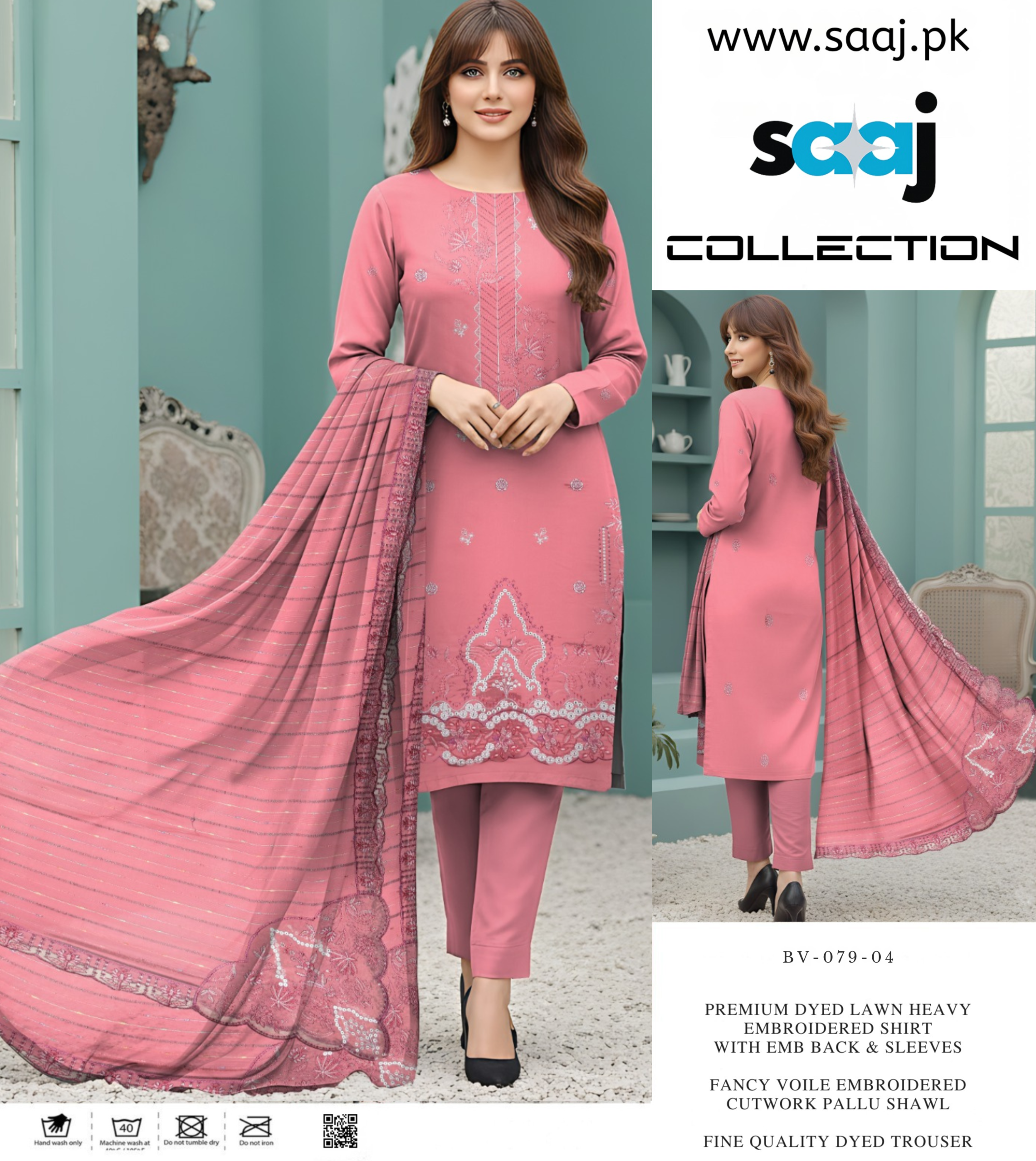 Embroidered Collection, Saaj, WomenPremium Dyed Lawn Heavy Embroidered 3-Piece Suit with Cutwork Voile Shawl – BV-079-04