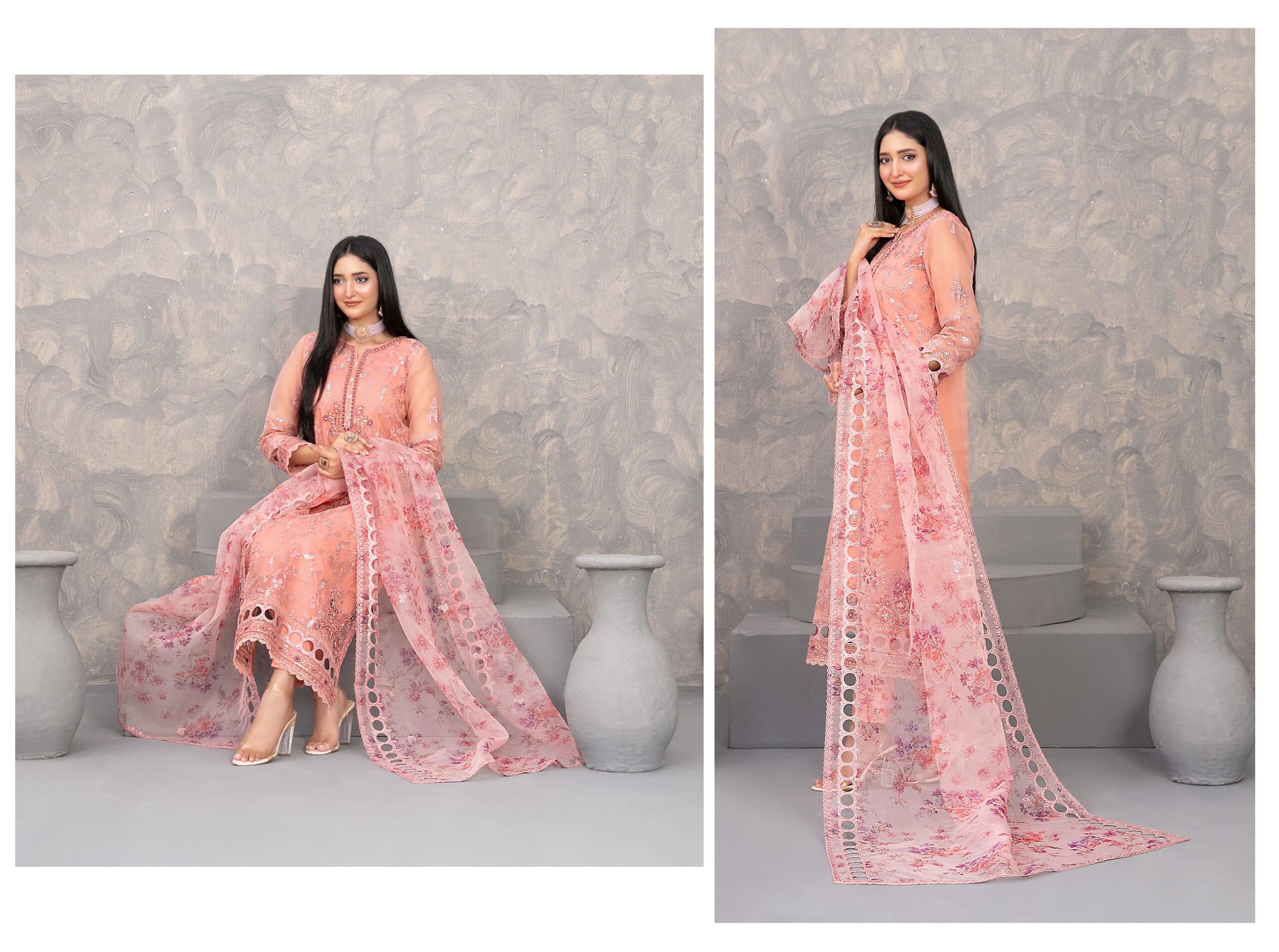 • Dupatta: Digitally printed organza dupatta with exclusive embroidery